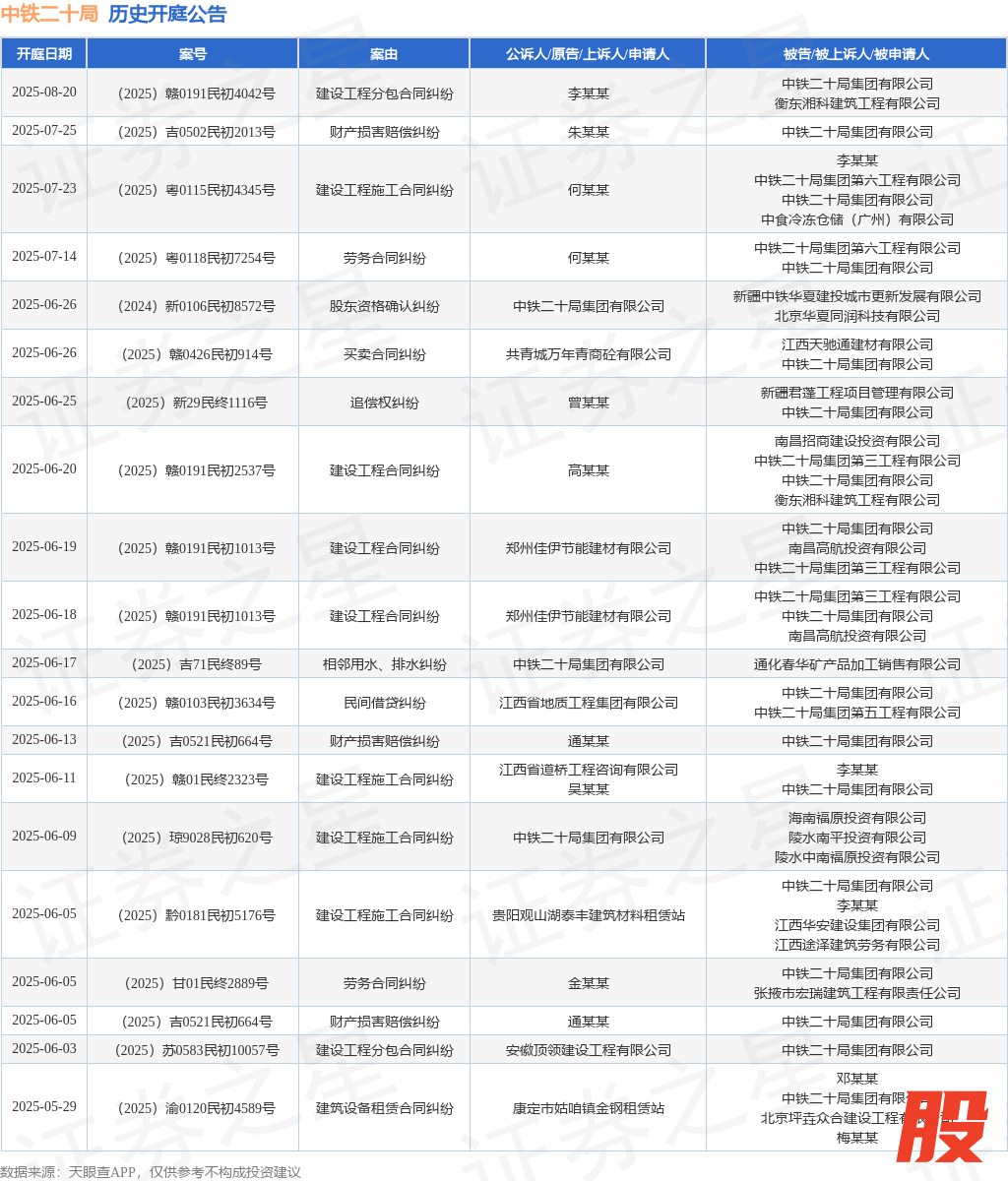 本站消息,根据天眼查APP显示跟投之家跟投之家,近日公布了一则中铁二十局集团有限公司作为被告/被上诉人的开庭公告,详细内容如下:
