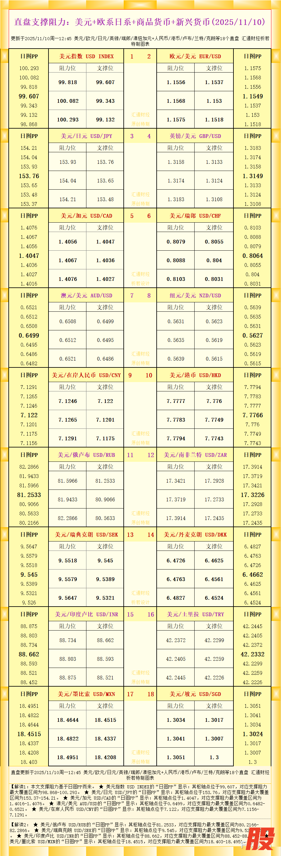 汇通财经APP讯——一张图看直盘支撑阻力:美元+欧系日系+商品货币+新兴货币,更新于2025年11月10日周一12:45,具体美元/欧元/日元/英镑/瑞郎/澳纽加元+人民币/港币/卢布/兰特/克朗等18个直盘,更多详见汇通财经析若特制图表中的内容。